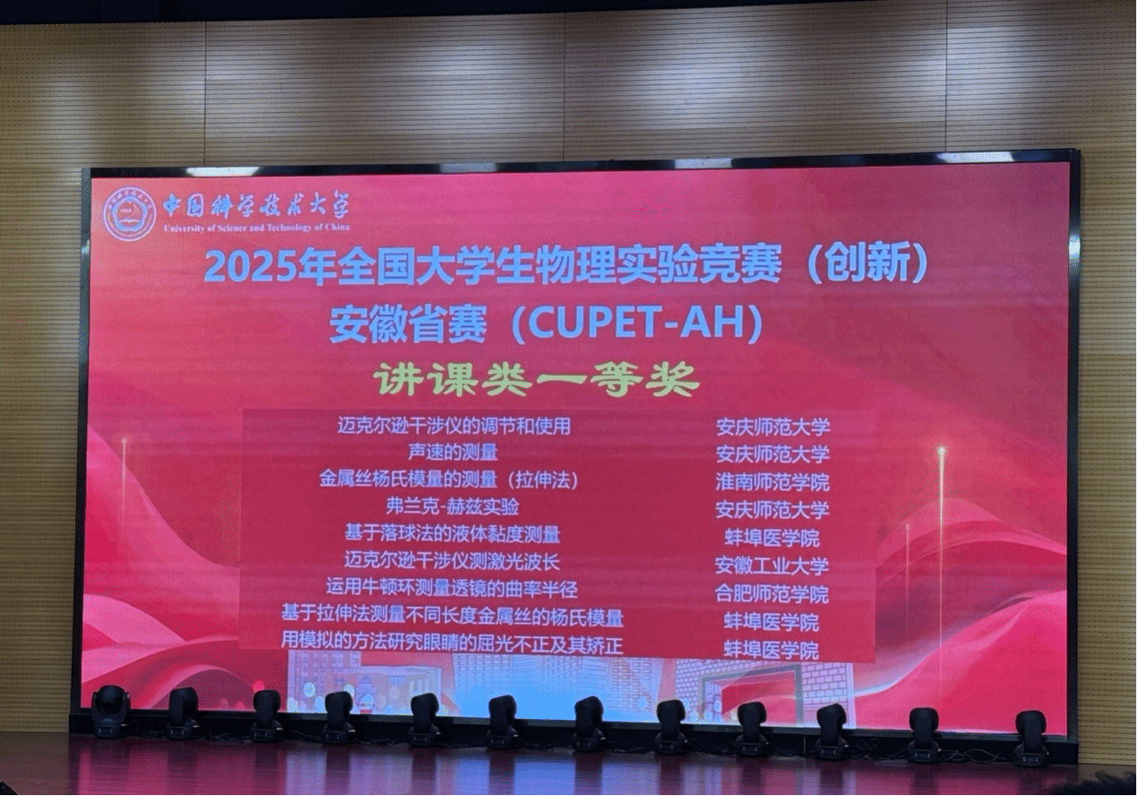 8月30日—9月1日,由安徽省大学物理课程教学指导委员会、安徽省物理学会和安徽省高校大学生物理实验竞赛组织委员会主办,中国科学技术大学物理学院承办的第一届安徽省高校大学生物理实验竞赛(创新)决赛(CUPET—AH)在中国科学技术大学举办,省内26所高校的272支队伍参与决赛角逐。我校新捕京3522com派出的9支代表队参加,经过省赛初赛和决赛,获得一等奖1项,二等奖2项,三等奖5项。不仅开辟了新征程,更是以敢打敢拼的精神、优异的成绩凸显了学校近年来在大学物理及实验的教学创新和人才培养上取得的显著成效。